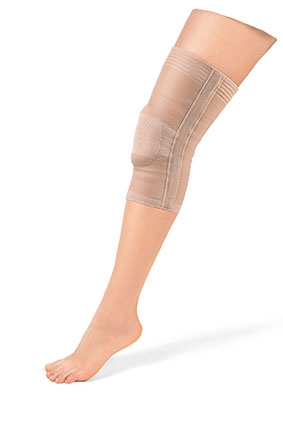 Guaina di maglia elasticizzata con inserto in silicone per sostegno e contenzione della rotula. Inoltre con il movimento dell'articolazione del ginocchio l'anello integrato di silicone produce una compressione e un massaggio benefico delle parti molli dell'articolazione. Una stecca per lato. Colore: pelle.