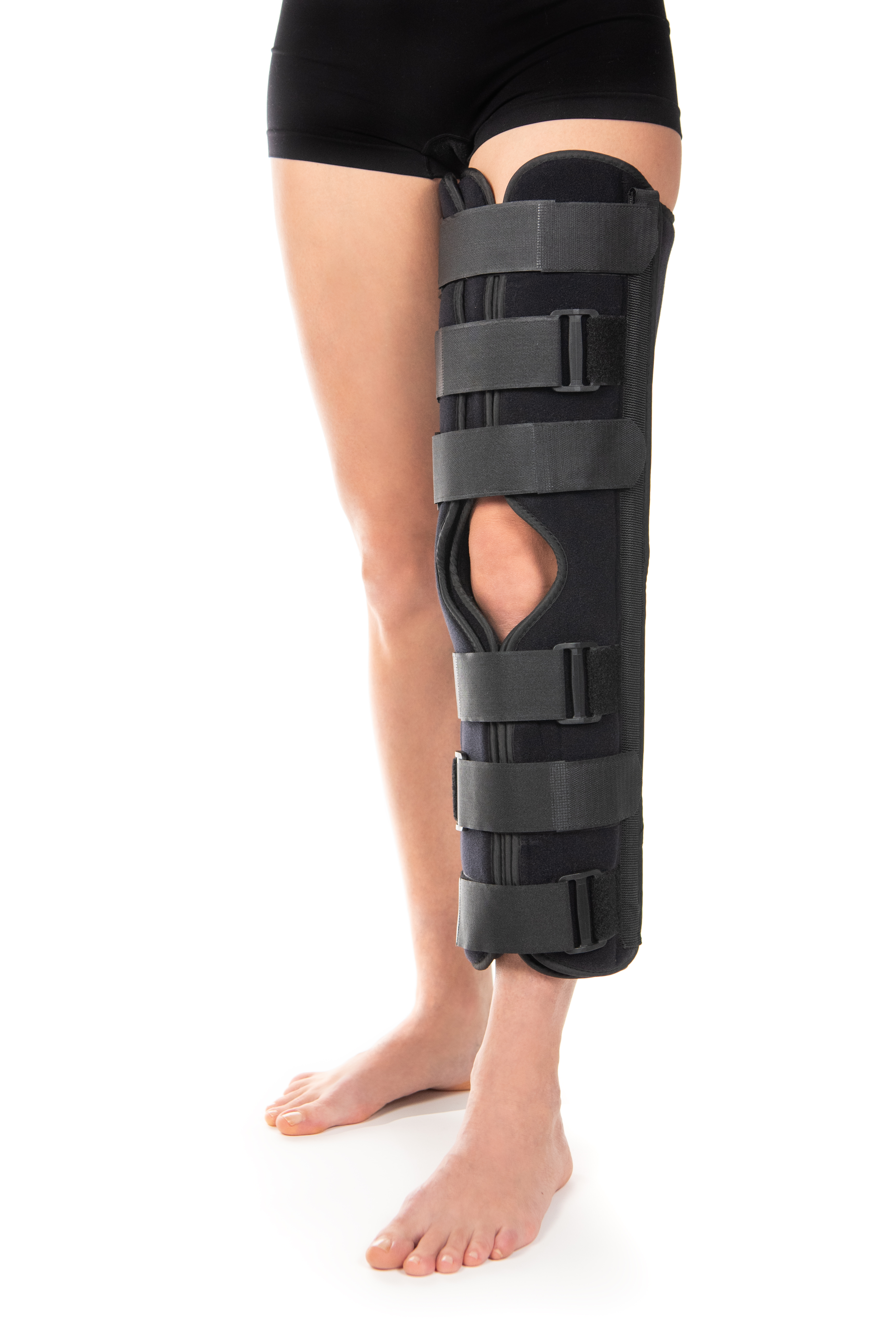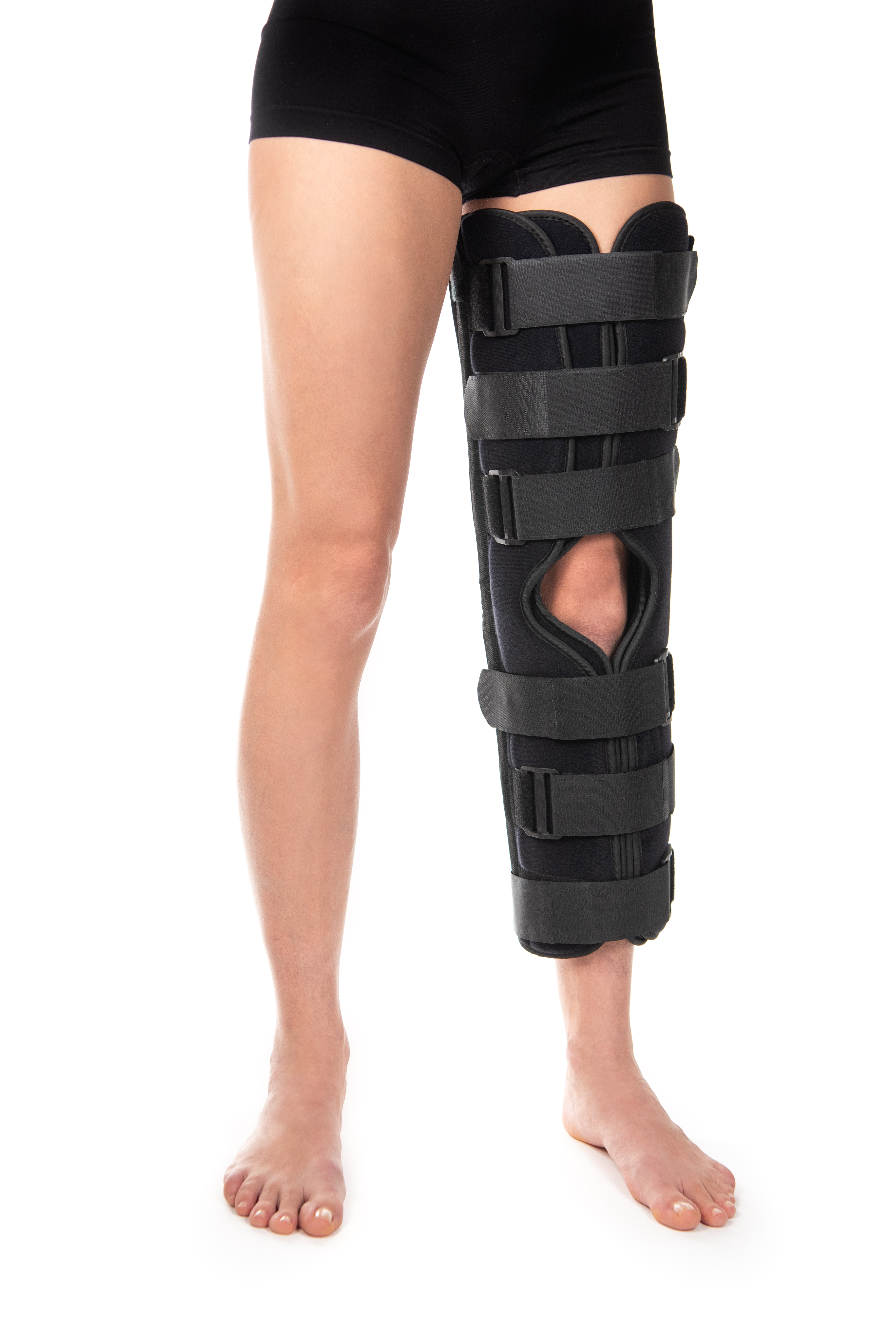 Stecca immobilizzatrice per ginocchio in tessuto stratificato soffice e confortevole. Apertura anteriore, chiusure regolabili in velcro. Per la tutela del ginocchio, in sostituzione del gesso. Munita di due stecche laterali e due posteriori.