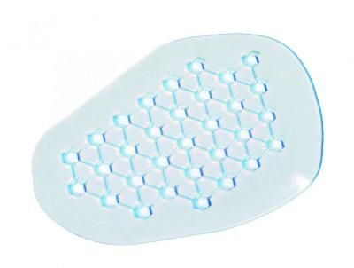 Sostegno delle teste metatarsali in morbido silicone. Allevia i dolori localizzati alla base delle dita dei piedi sotto le teste metatarsali sostenendole e proteggendole dalle pressioni. Esercita un massaggio dell'area dolorante ad ogni ciclo del passo. Speciale disegno di superficie, costituito da un'alternanza di salienze e depressioni romboidali.