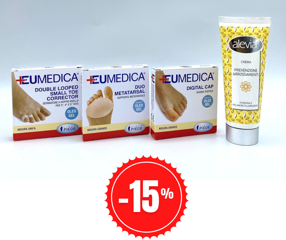 É semplice! La promo kit Eumedica ti aiuterà ad alleviare e prevenire i fastidi legati alle dita che si accavallano, metatarsalgie,sfregamenti contro la scarpa, calli e veschiche.