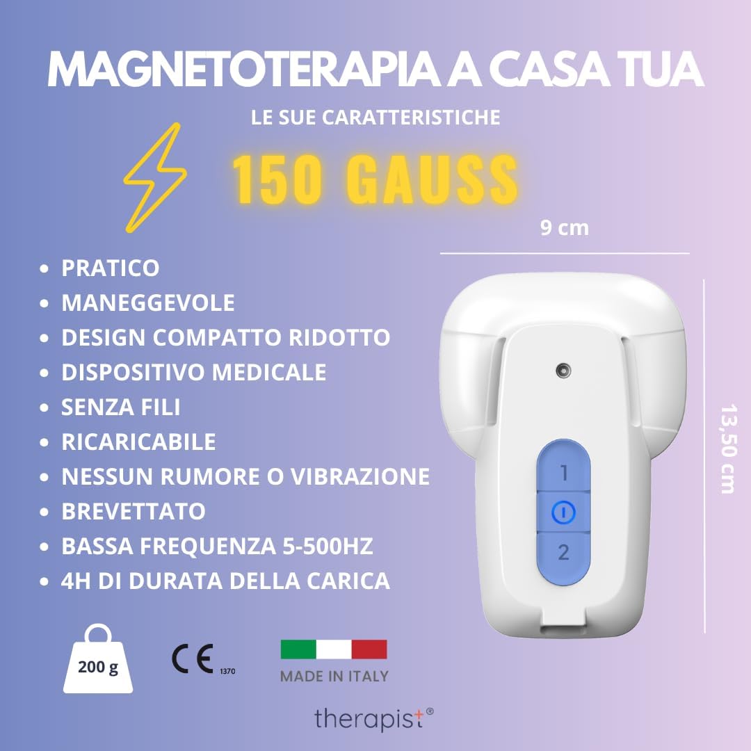 • 🧲 Tecnologia All-in-One, tutto in uno: THERAPIST rappresenta una novità nel campo della magnetoterapia. Dispositivo medico brevettato, ideato per trattamenti professionali e domiciliari. Ha un design compatto che incorpora un solenoide integrato: un valido alleato nella lotta contro i dolori osteo-articolari. L'applicazione di questa magnetoterapia a bassa frequenza è così semplice che l' utilizzo quotidiano diventa intuitivo.