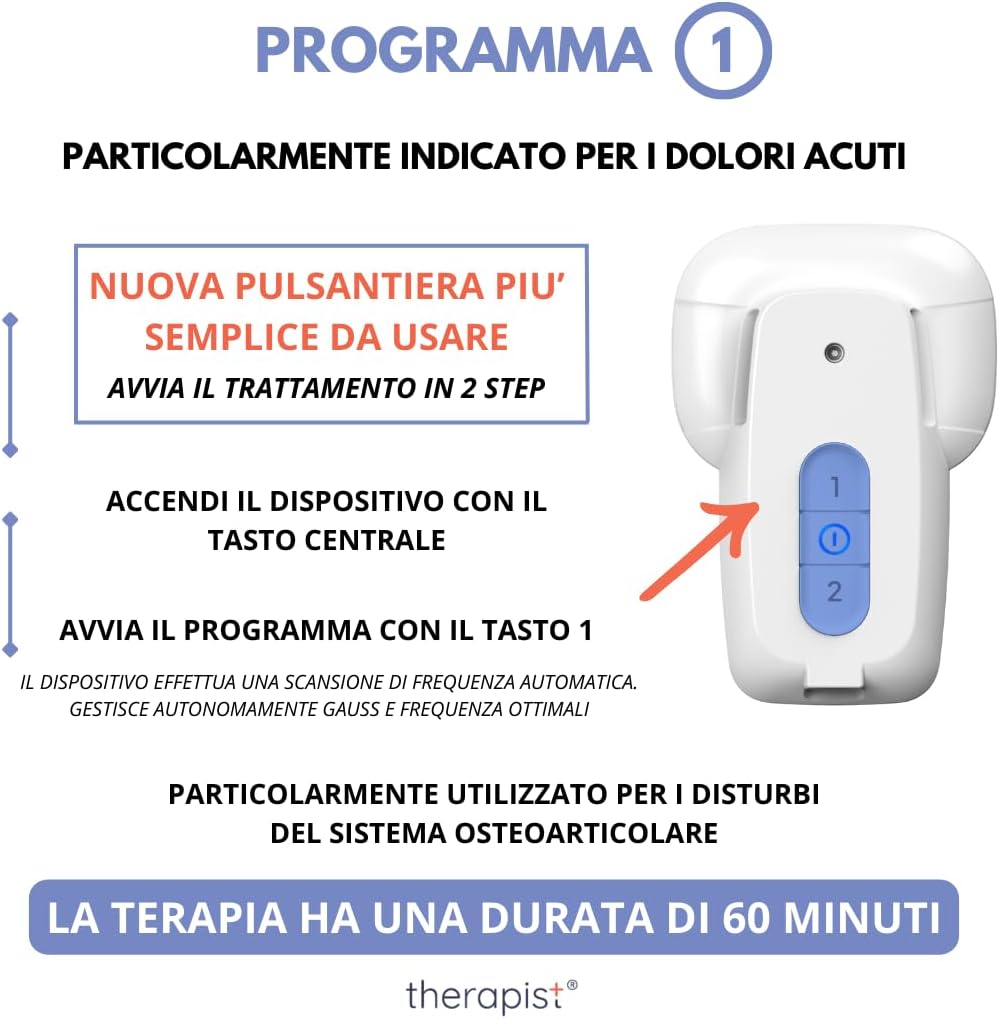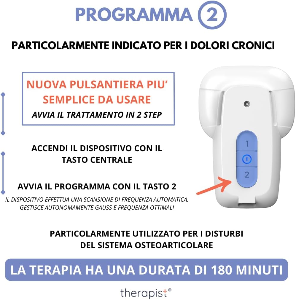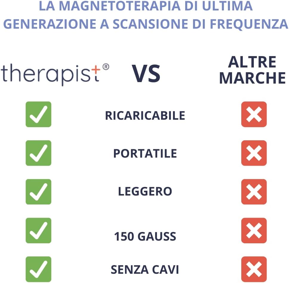 • 🆕 Magnetoterapia con tecnologia MADE in ITALY: THERAPIST è dotato di una tecnologia innovativa. Munito di due programmi a scansione di frequenza, non richiede selezione di programmi specifici. È inoltre sprovvisto di solenoidi esterni: un dispositivo per magnetoterapia completamente integrato, senza fili né accessori.